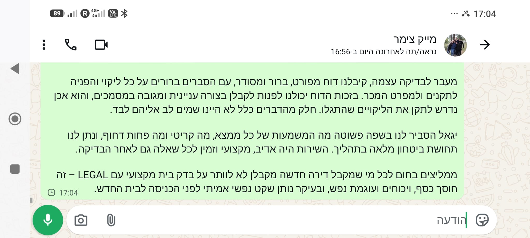 "קיבלנו דוח מפורט, ברור ומסודר. יגאל הסביר לנו בשפה פשוטה מה המשמעות של כל ממצא. ממליצים בחום לכל מי שמקבל דירה חדשה!"